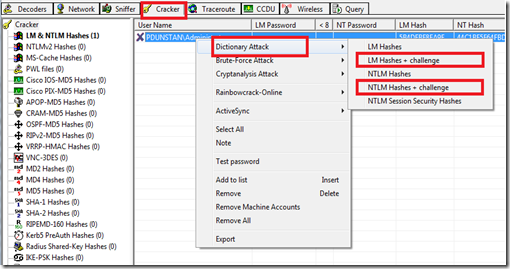 If Cain was used to sniff the capture, right click on the entry and select “Send to Cracker”.